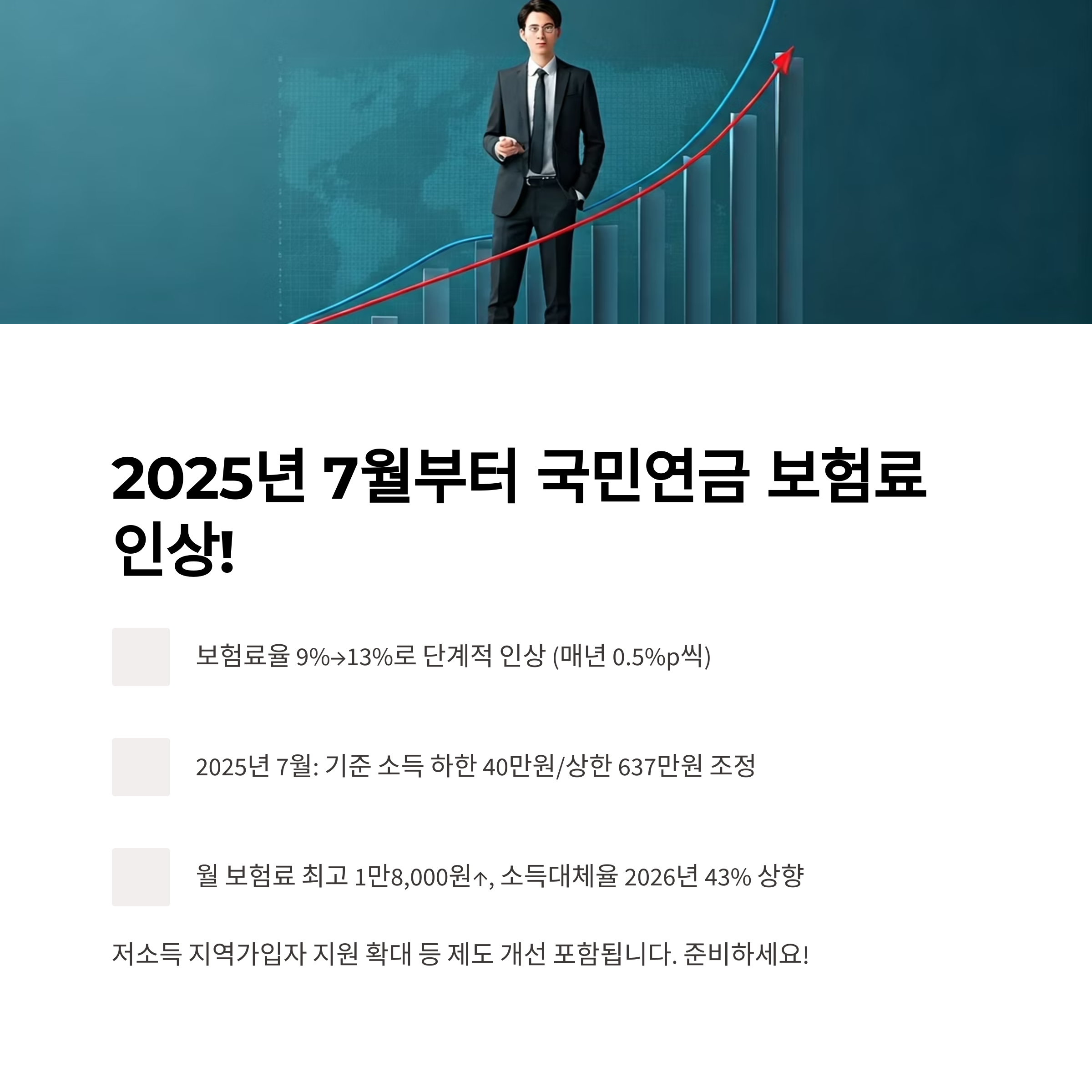 🔗 국민연금공단 공식 안내 바로가기2025년 7월부터 국민연금 보험료 인상! 얼마나 더 내야 할까?#국민연금 #보험료인상 #기준소득월액 #상한액 #하한액 #직장가입자 #지역가입자 #연금액증가2025년 7월, 국민연금 보험료 인상이 확정됐다는 소식 들으셨나요? 이번에는 기준소득월액 상한액·하한액이 모두 조정되면서, 일부 가입자의 월 보험료가 인상됩니다.직장가입자, 지역가입자 모두 해당되는 내용이고, 실제로 얼마나 오르고, 누가 영향받는지, 그리고 연금액 증가와 보험료율, 국민연금 계산기 등 꿀팁까지 자세히 알아보겠습니다.기준소득월액, 왜 매년 바뀌나요?국민연금 보험료는 기준소득월액이라는 소득 구간을 기준으로 부과됩니다.아무리 소득이 높아도 상한액까지만, 아무리 낮아도 하한액 이상은 내야 하죠.이 기준은 ..